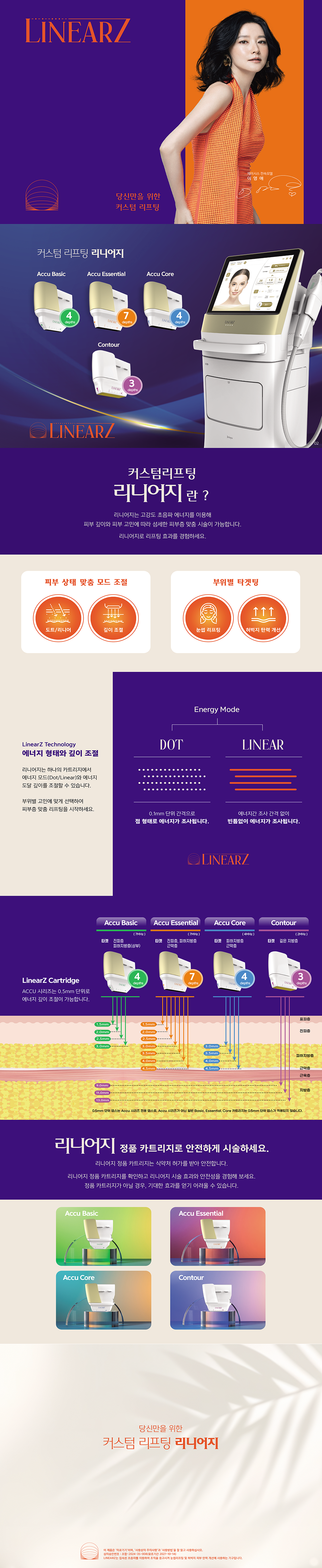 리니어지는 기존 리니어펌의 업그레이드 버젼으로, 고강도 집속 초음파(HIFU) 기술을 사용하는 피부 리프팅 장비입니다.