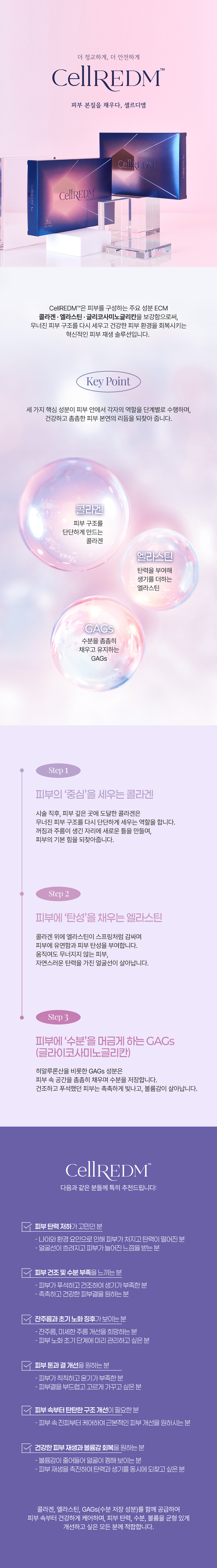 단순한 콜라겐 자극이 아니라, 손상된 ECM 구조 자체를 보완해 피부 구조 복원을 목표로 합니다. 주로 탄력 저하, 얇아진 피부, 잔주름 개선 목적의 재생 중심 시술로 분류됩니다.
