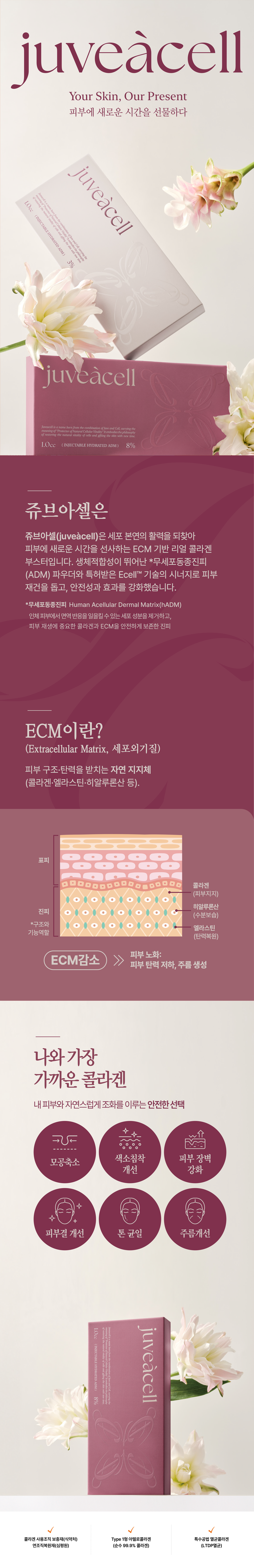기존 제품들이 콜라겐 생성을 '유도'하는 방식이었다면, 쥬브아셀은 콜라겐, 엘라스틴, 히알루론산 등 ECM 구성 성분을 직접 주입한다는 점이 특징입니다