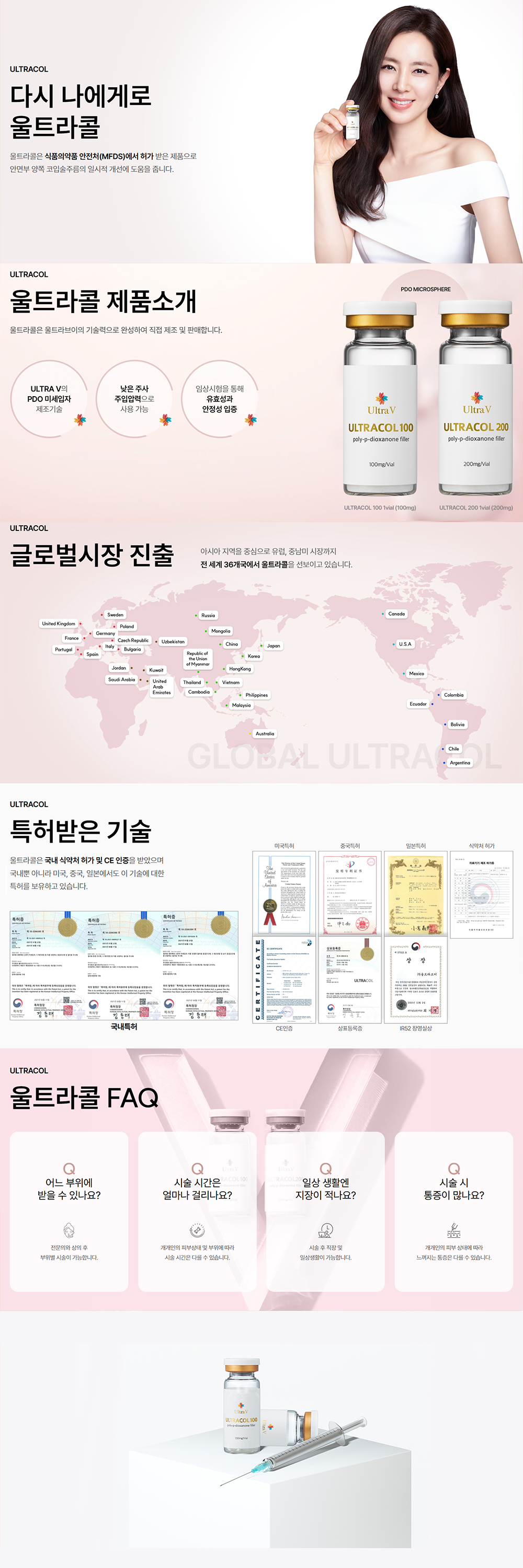 울트라콜은 PDO(폴리디옥사논) 성분을 미세한 구형 입자 형태로 만들어 피부에 주입하는 스킨부스터로, 1~2개월 후 자가 콜라겐 생성을 촉진하여 자연스러운 볼륨과 탄력, 리프팅 효과를 제공하는 시술입니다.