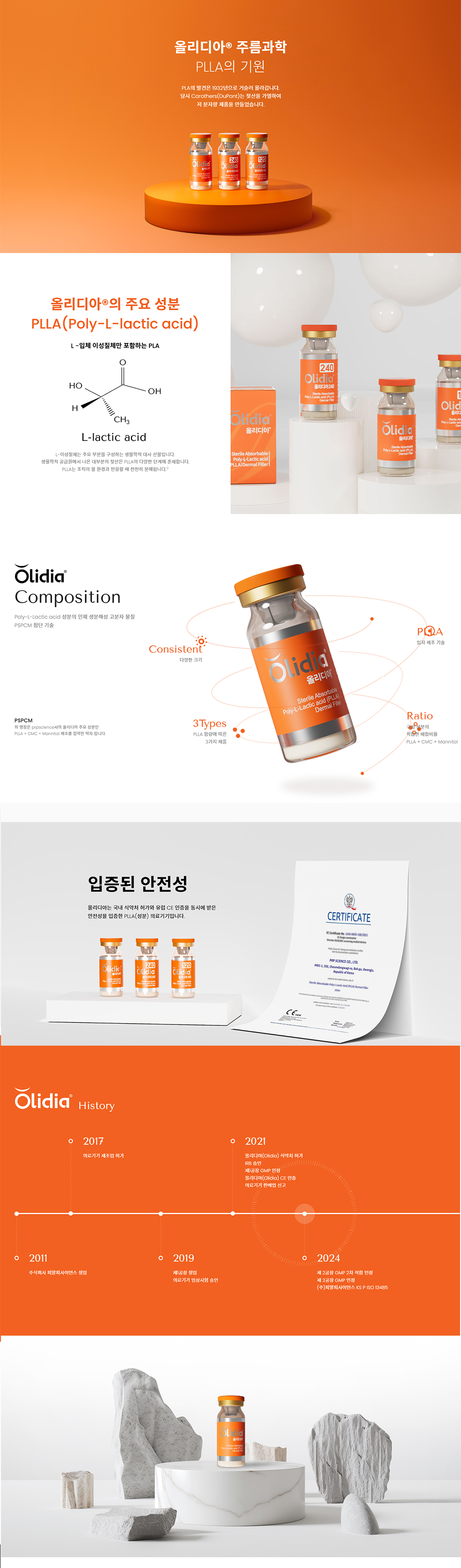 올리디아(Olidia)는 PLLA(Poly-L-lactic acid ) 성분을 사용하여 체내 콜라겐 생성을 촉진, 피부 탄력과 볼륨을 개선하는 스킨부스터입니다.